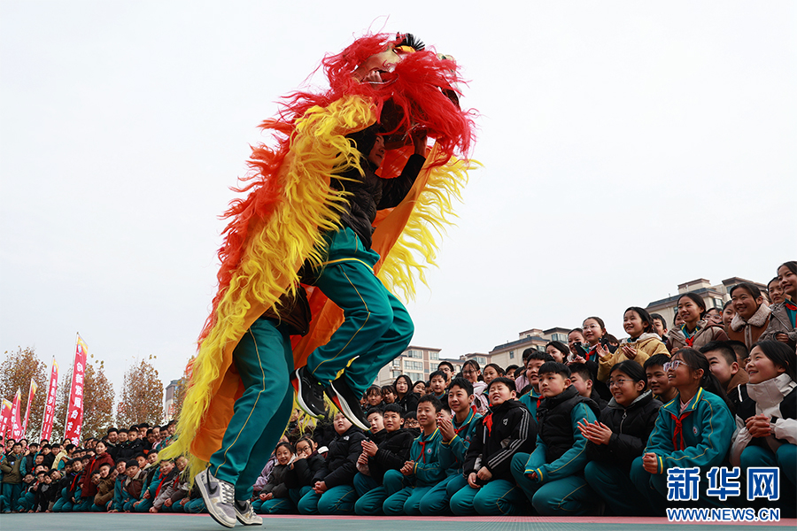 12月9日,河南省安阳市内黄县飞翔学校,学生们在观赏舞狮。