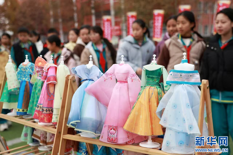 12月9日,河南省安阳市内黄县飞翔学校,学生们在观赏传统服饰。