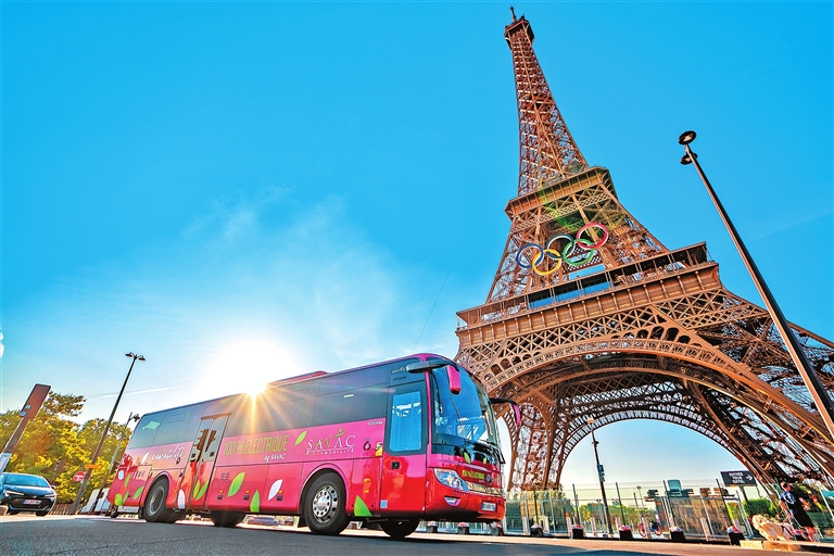 2024年7月17日,法国巴黎埃菲尔铁塔下,来自河南的宇通客车正从奥运五环下经过。王亚鸽 摄