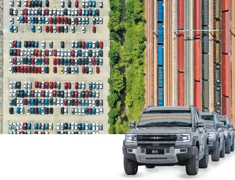 一辆辆新能源汽车在郑州国际陆港集结,准备搭乘中欧班列驶向世界各地。王铮 栗璋鹏 摄 比亚迪豹5下线。企业供图
