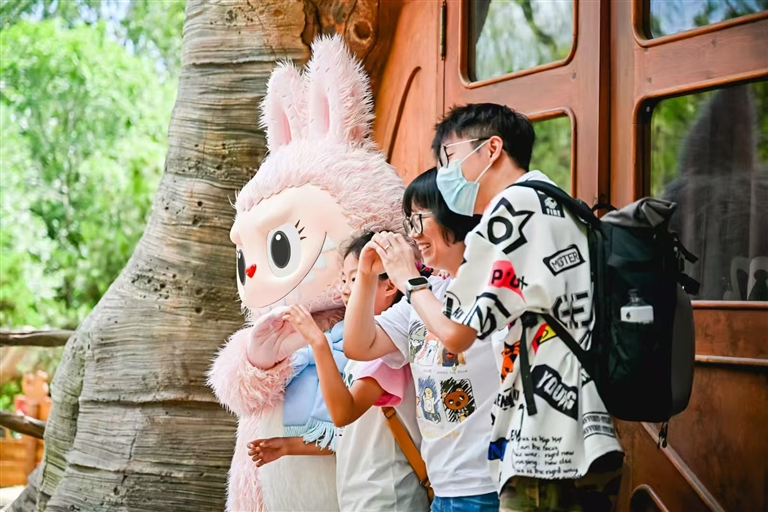 游客在泡泡玛特城市乐园与人偶互动。 企业供图