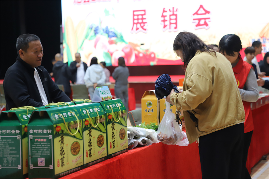 9月23日,范县农特产品展销会现场,一名顾客在购买商品。