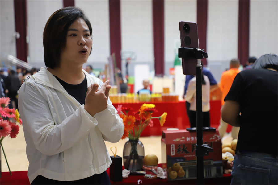 9月23日,范县农特产品展销会现场,一名主播在直播带货。