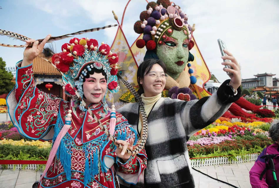 10月18日,游客在开封市龙亭公园拍照赏菊花。李新义 摄