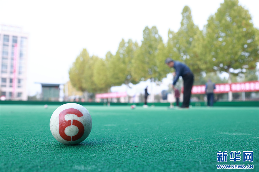 10月29日,在内黄县老干部教育活动中心,一名学员在进行门球训练。