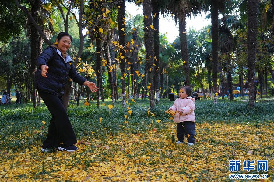 11月11日,南阳人民公园内,市民带着孩子在银杏树下游玩。