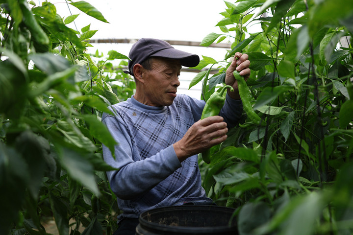 11月12日,在河南省安阳市内黄县繁阳街道王思庄村,种植户在大棚里采摘尖椒。