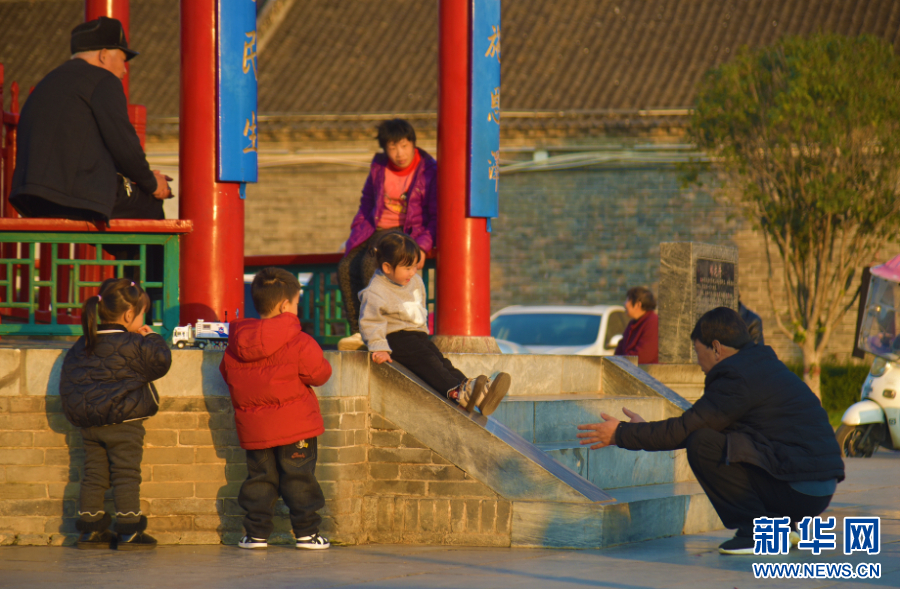 在南阳市社旗县文化广场,家长在陪伴儿童玩耍。张举 摄