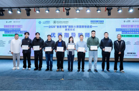 河南工业设计研究院副院长訾鹏和副校长孙文杰共同为“河南文创工业设计中心”揭牌,该中心于2024年9月被省工业和信息化厅认定为省级工业设计中心。中心将致力于推动本土文创设计与产业需求的深度融合,积极服务中原文化建设。活动现场还为往届联合毕业设计优秀指导教师及“老家河南”摄影大赛获奖者颁奖,并共同启动了2026UGD河南站活动与“老家河南”摄影作品展。