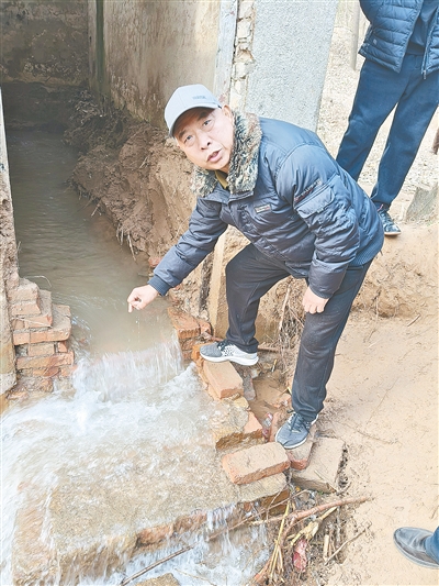 记者跟着人群走向河床内的一个机井房,周边已聚集百余人。机井口正涌出大股水流,水花呈蘑菇状向四周散开,随后向北漫出门口(如图)。