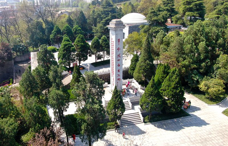 人们在鄂豫皖苏区首府烈士陵园革命烈士纪念碑前祭奠。河南省新县地处大别山腹地,是鄂豫皖苏区首府所在地,这里先后诞生了红四方面军、红二十五军、红二十八军等多支红军主力(2021年4月4日摄 无人机照片)。新华社记者 郝源 摄