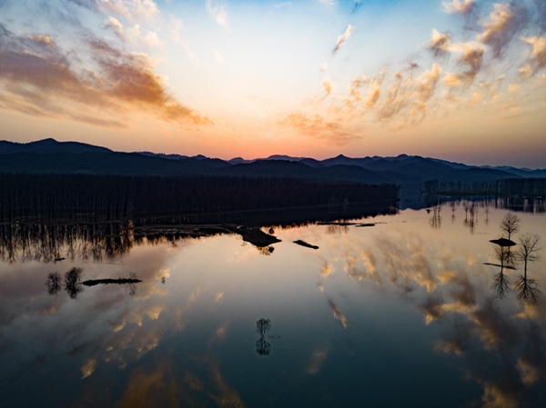 暮色降临之时,晚霞浸染天际。橘红与淡紫交织的霞光倒映水中,水面与天空交融成一幅浑然天成的画卷。王勃笔下“落霞与孤鹜齐飞,秋水共长天一色”的千古意境,在此刻的冲口村徐徐铺展。
