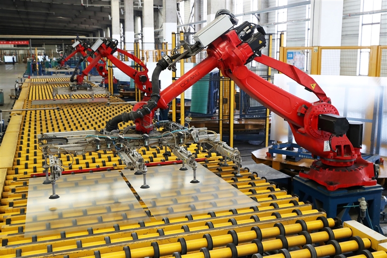 在位于襄城县的许昌安彩新能科技有限公司,工业机器人在生产线上精细作业。牛书培 摄