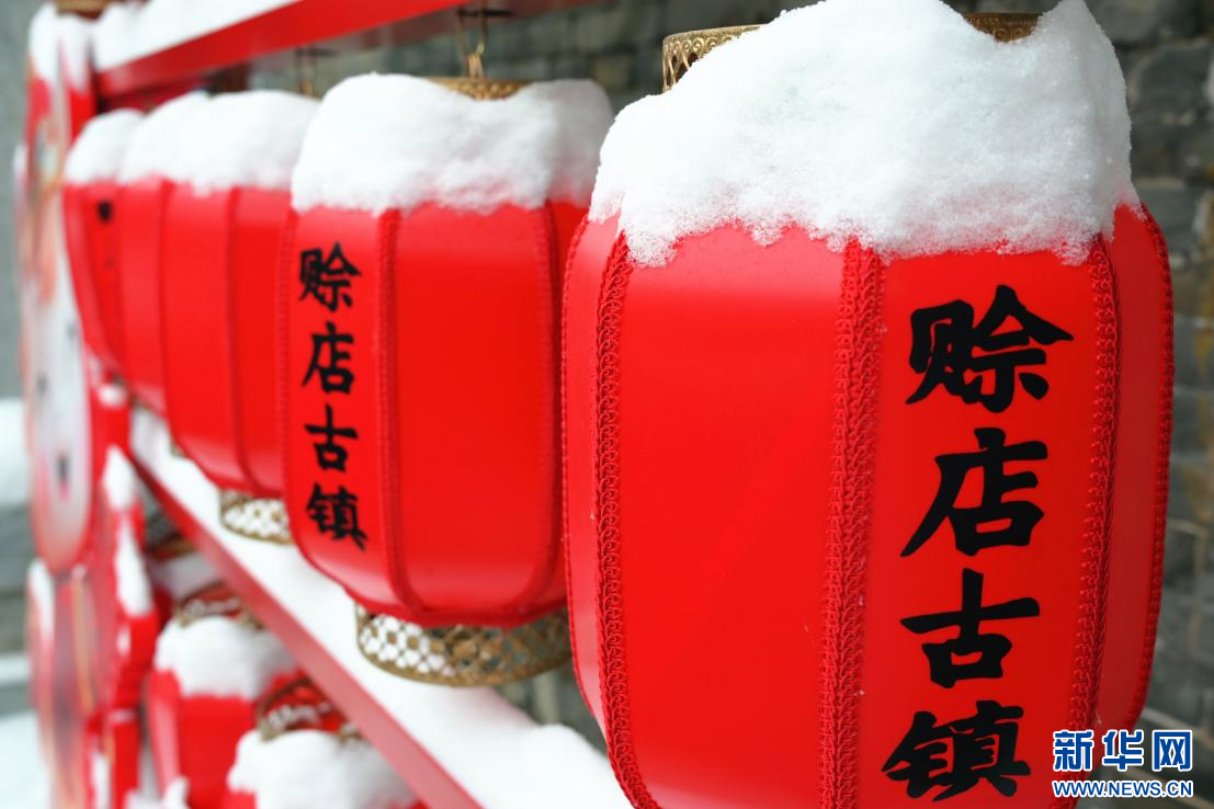 1月20日,在河南省南阳市社旗县,白雪与红灯笼相映成画。申鸿皓 摄