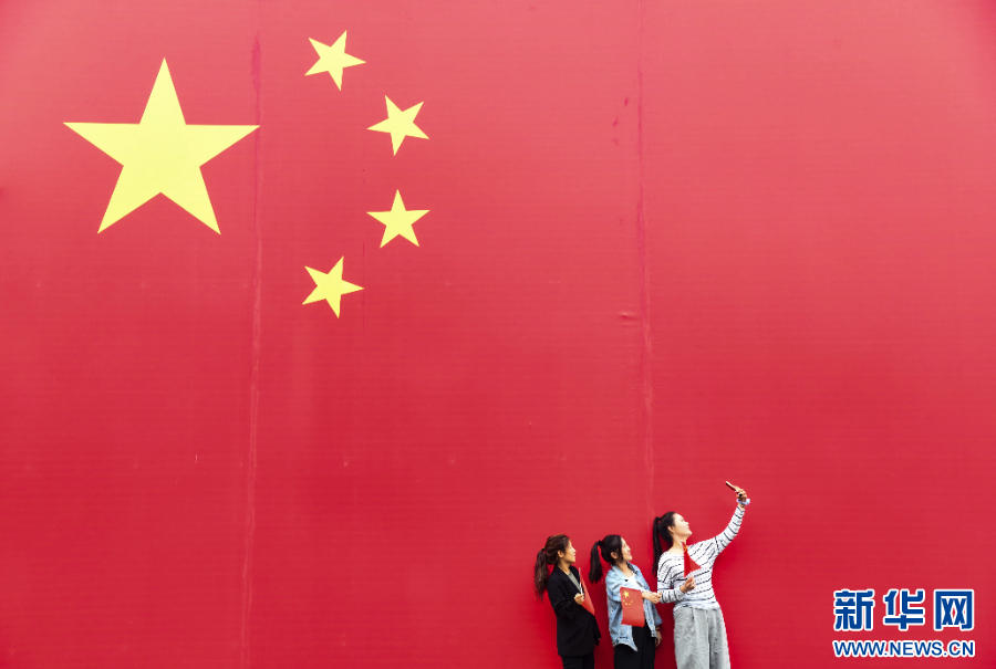2025年10月1日,在河南省济源市那些年小镇,游客与国旗合影。新华社发(苗秋闹 摄)