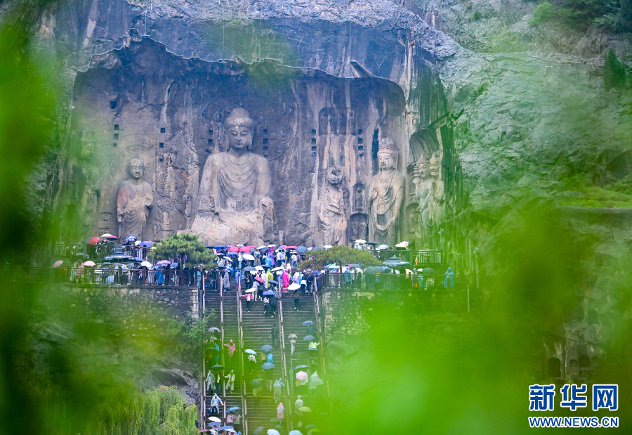 2025年10月1日,游客冒雨游览位于河南洛阳的龙门石窟。新华社发(李卫超 摄)