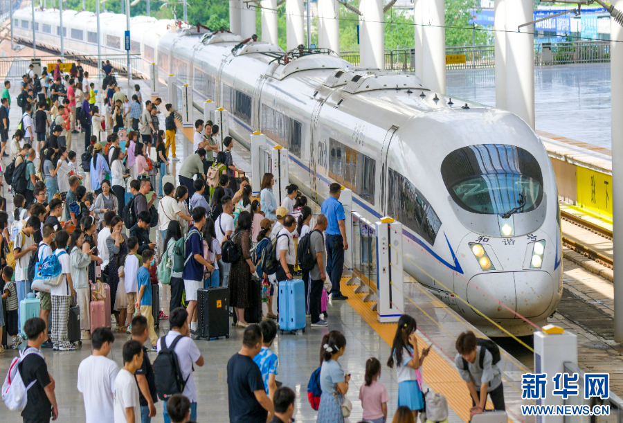 2025年7月1日,旅客在河南洛阳龙门站乘车。当日,全国铁路实行新的列车运行图,同时为期62天的2025年全国铁路暑期运输也拉开帷幕。新华社发(张怡熙 摄)