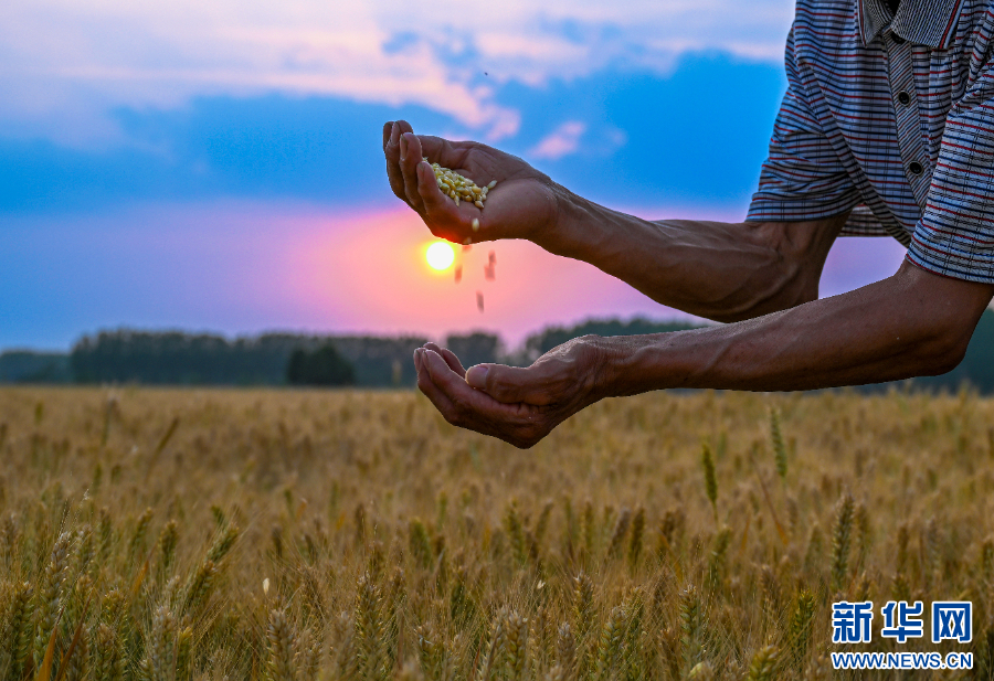 2025年5月21日,河南省商丘市夏邑县会亭镇贾楼村农民在麦田内查看麦粒饱满程度。麦收时节,各地农民抢抓农时抢收小麦,确保颗粒归仓。新华社发(王高超 摄)