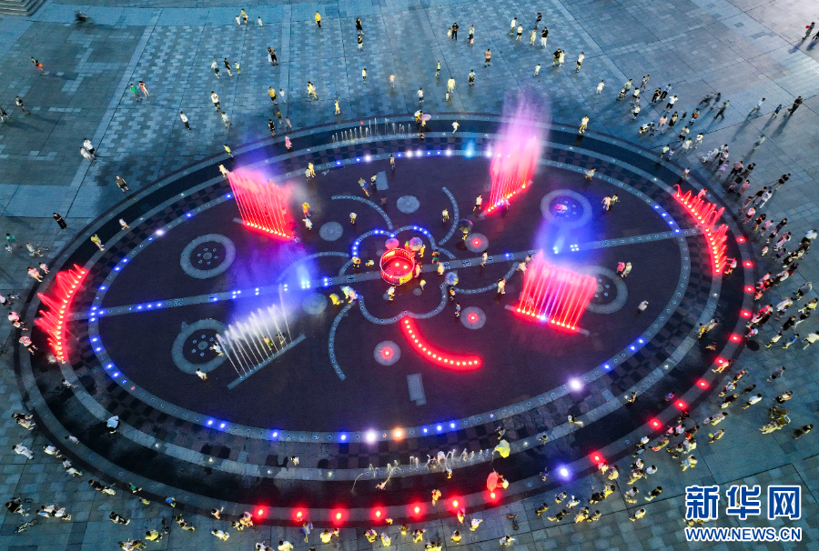 2025年7月24日,市民和游客在河南省济源市世纪广场赏喷泉纳清凉(无人机照片)。新华社发(苗秋闹 摄)