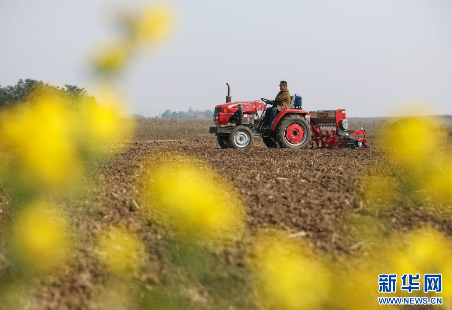 2025年11月3日,河南省平顶山市宝丰县大营镇赵楼村农民驾驶农机播种冬小麦。新华社发(何五昌 摄)