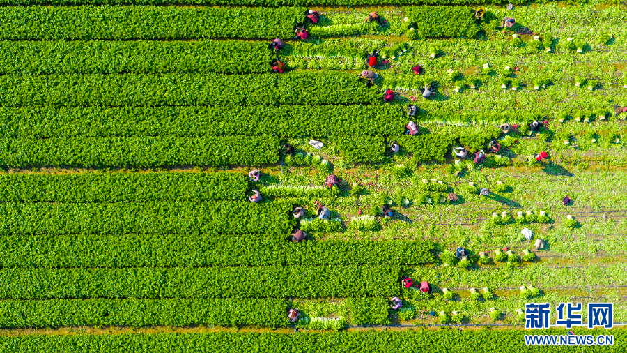 2025年11月21日,农民在河南省商丘市睢县董店街道董东村一处农田采收芹菜(无人机照片)。新华社发(徐泽源 摄)