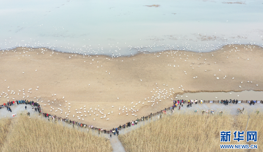 2025年12月20日,游客在河南省三门峡市天鹅湾观赏天鹅(无人机照片)。新华社发(刘肖坤 摄)