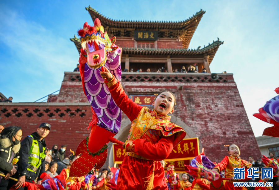 2025年2月12日,在河南省鹤壁市浚县古城,小朋友在进行民俗表演。当日是元宵节,各地举办多彩活动,欢欢喜喜闹元宵。新华社发(王高超 摄)