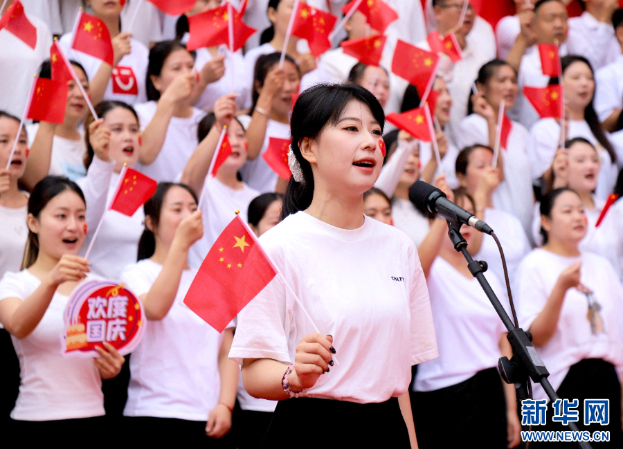 2025年9月30日,在河南省南阳市区万悦城广场,当地群众齐唱歌曲《我和我的祖国》。新华社发(高嵩 摄)