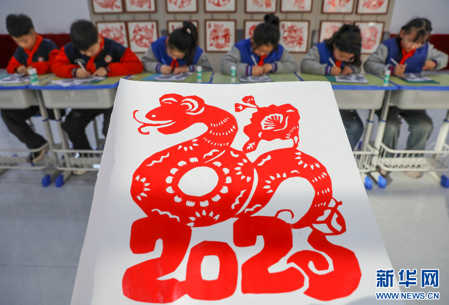 2024年12月30日,河南省平顶山市宝丰县山河路小学的学生在参加剪纸迎新年创作活动。新华社发(何五昌 摄)