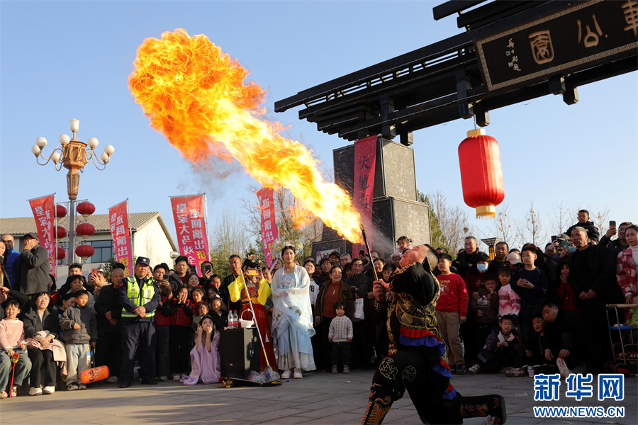 2月19日,在河南省济源市古轵公园,民间艺人为游客表演喷火。新华社发(段二平 摄)