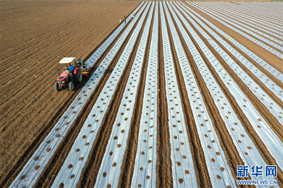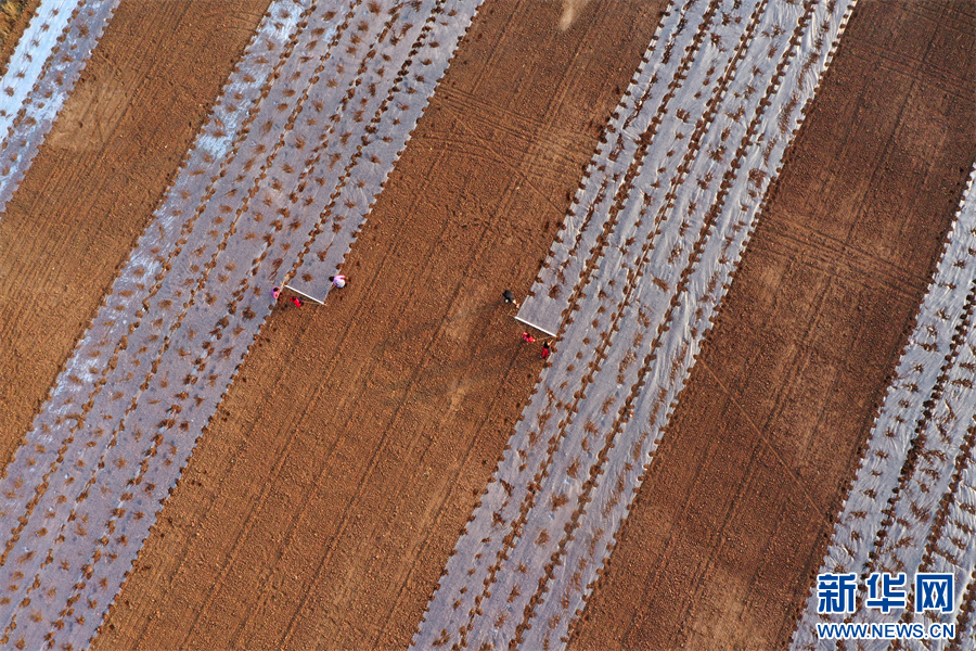 1月5日,农民在河南省沁阳市柏香镇东司马村田间覆盖地膜(无人机照片)。新华社发(杨帆 摄)
