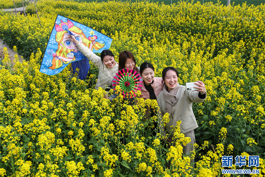 3月26日,河南省焦作市博爱县金城乡韩庄村,游客在油菜花旁拍照打卡。新华社发(程全 摄)