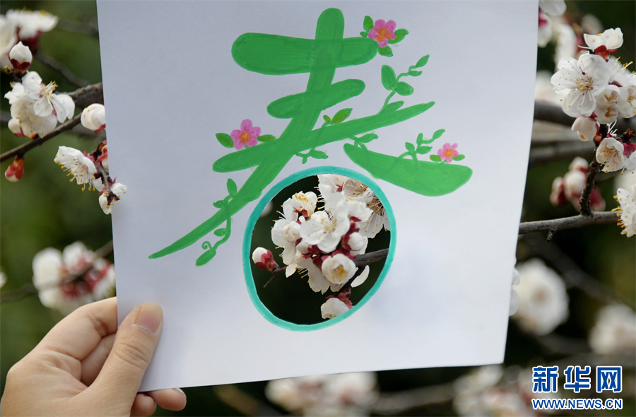 3月11日,游人在杏花盛开的河南省鹤壁市淇滨区泰山路街道办事处福田社区游玩拍照。新华社发(赵永强 摄)