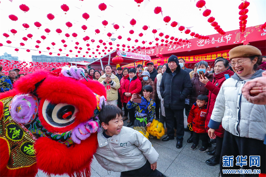 2月3日,在河南省信阳市光山县司马光广场年货市场,市民与舞狮表演艺人互动。新华社发(谢万柏 摄)