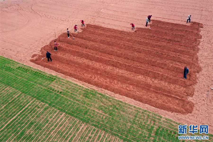 2月25日,河南省沁阳市王曲乡东王曲村,农民在田间整地作畦(无人机照片)。新华社发(杨帆 摄)