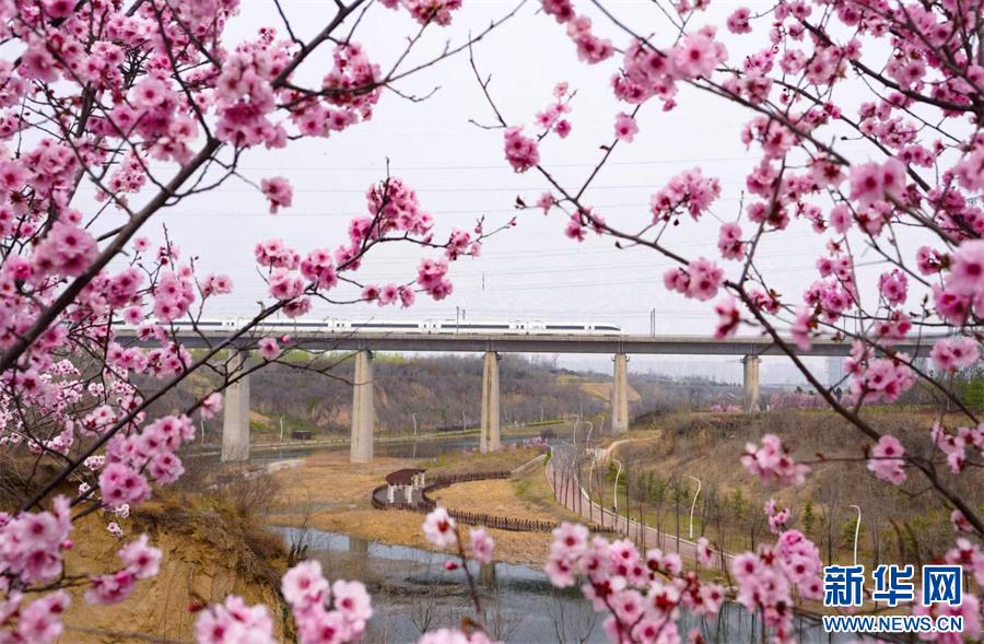 3月19日,一列高铁列车驶过路边开满鲜花的徐兰高速铁路郑州段。新华社发(马健 摄)