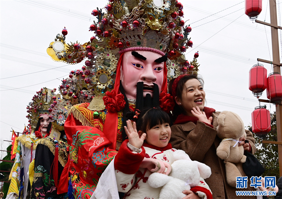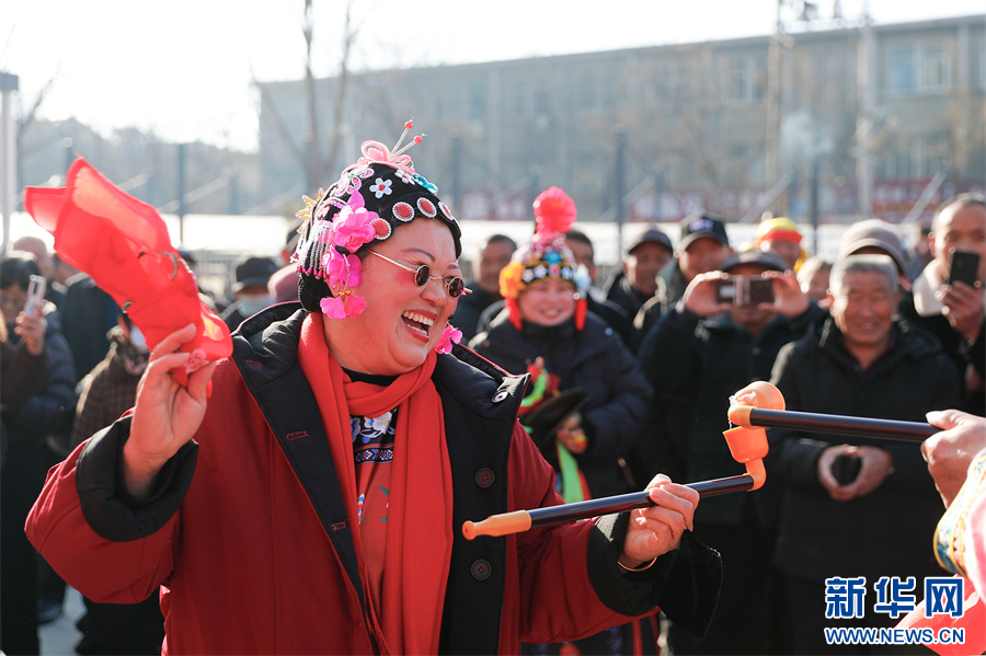 2月10日,在河南省周口市川汇区关帝庙广场,进行表演的民间艺人与观众互动。新华社发(高建中 摄)