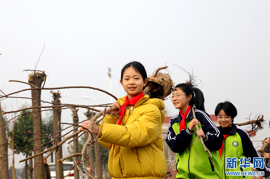3月11日,在河南省济源市梨林镇梨林中心小学,小学生参加植树活动。新华社发(段二平 摄)