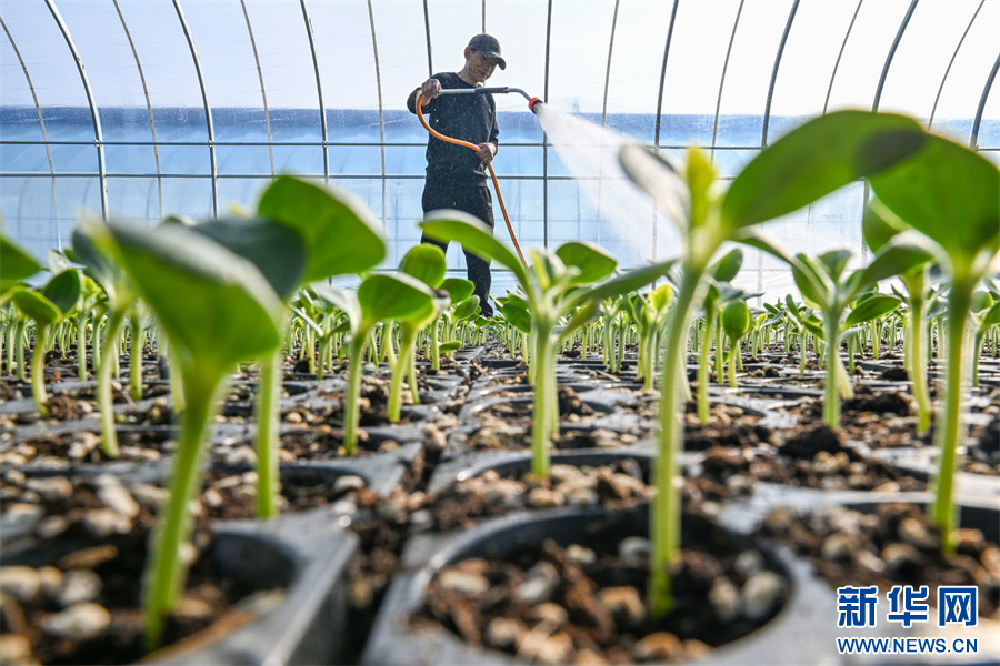 2月4日,在河南省商丘市夏邑县曹集街道一家瓜果育苗基地,村民给瓜苗浇水保墒。新华社发(王高超 摄)