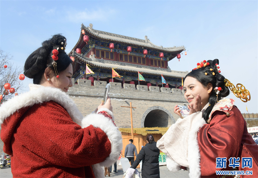 2月17日,身着传统服装的游客在河南省鹤壁市浚县古城拍照。新华社发(赵永强 摄)