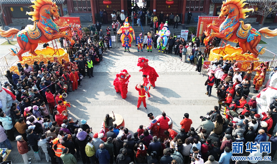 3月3日,游客在河南省许昌市灞陵桥景区观看舞狮表演(无人机照片)。新华社发(牛书培 摄)
