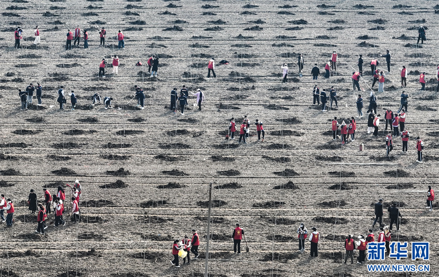 3月12日,在河南省济源市承留镇南勋村,志愿者参加义务植树(无人机照片)。新华社发(苗秋闹 摄)