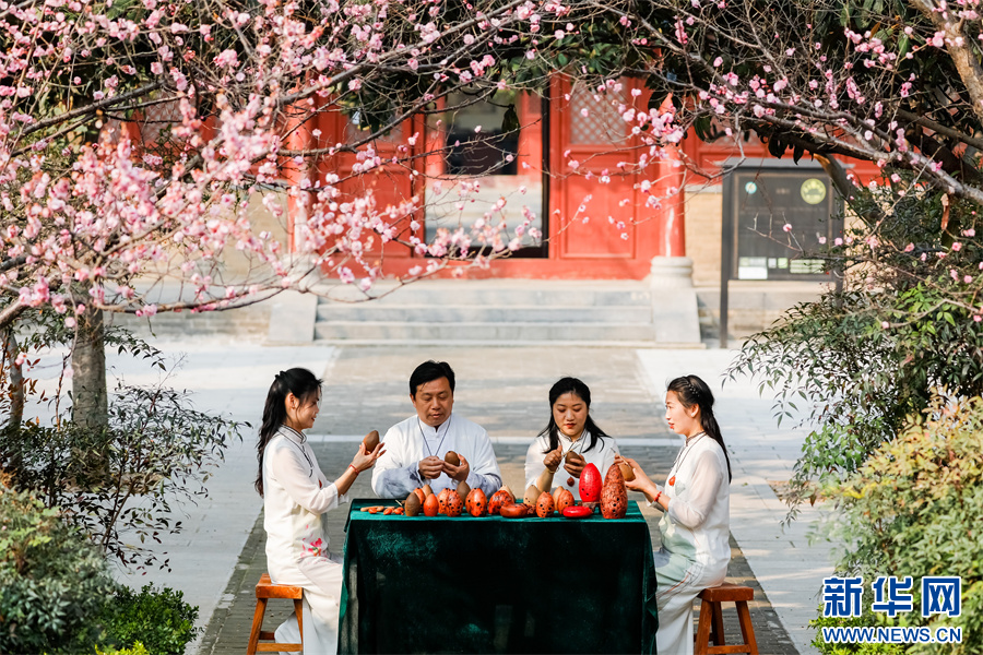 3月12日,河南省武陟县嘉应观黄河文化博物馆工作人员在花树下制作泥埙。新华社发(王琳锋 摄)