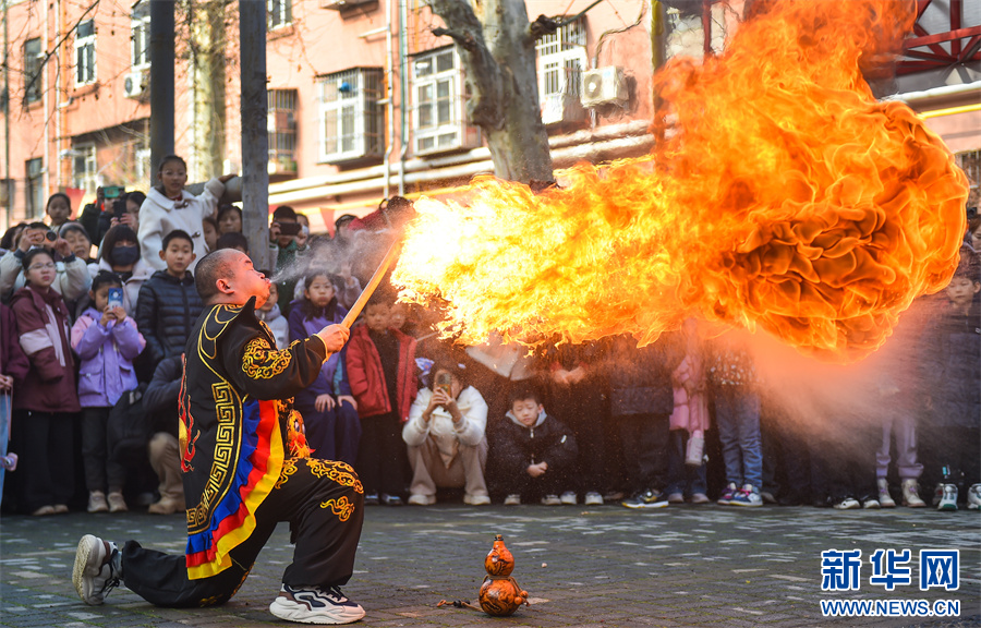 3月3日,人们在河南省洛阳市涧西区重庆路街道二社区举行的“元宵喜乐会”非遗市集传统文化体验活动中观看喷火表演。新华社发(黄政伟 摄)