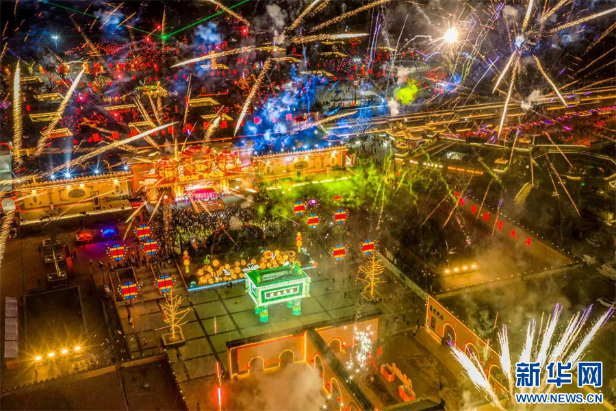 2月10日农历腊月二十三,河南省三门峡市陕州区地坑院景区举行烟花秀表演(无人机照片)。新华社发(杜杰 摄)