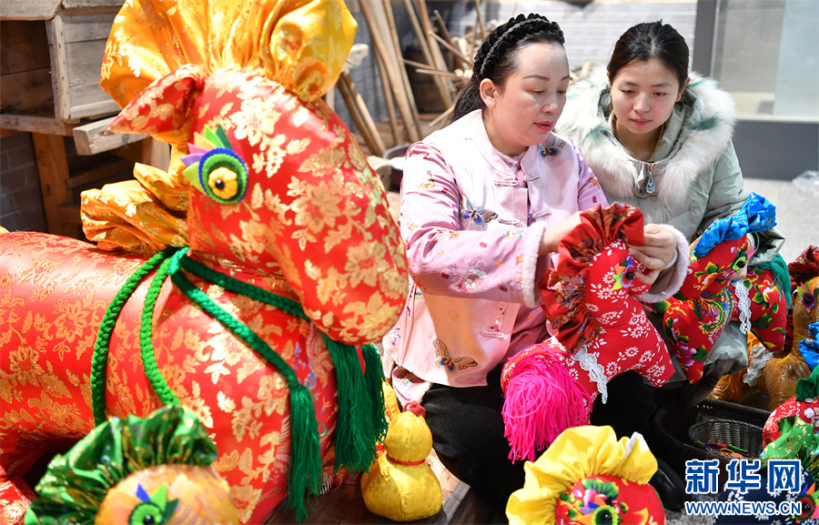 1月22日,河南驻马店市非遗香包制作技艺传承人王彩红(左)赶制新春特色香包。新华社发(弓华静 摄)