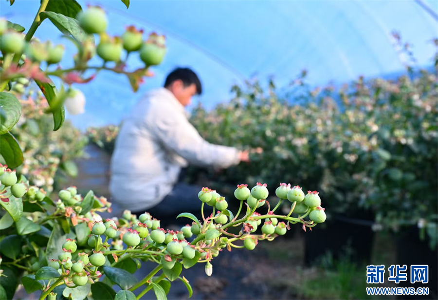 2月4日,在河南省商丘市夏邑县太平镇太平西村蓝莓园,农民为蓝莓疏花疏果。新华社发(苗育才 摄)