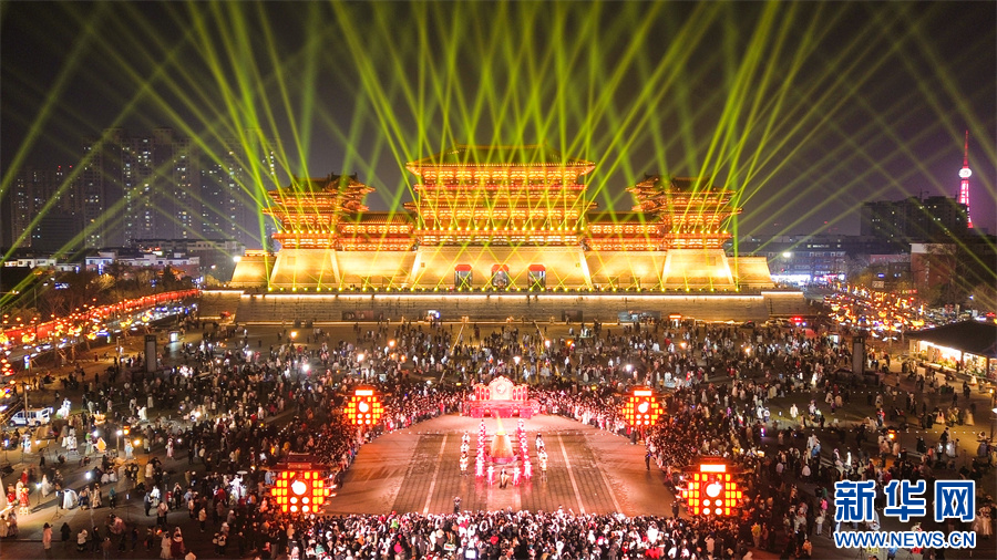 1月1日,游客在河南省洛阳市隋唐洛阳城国家遗址公园内欣赏演出。新华社发(黄政伟 摄)