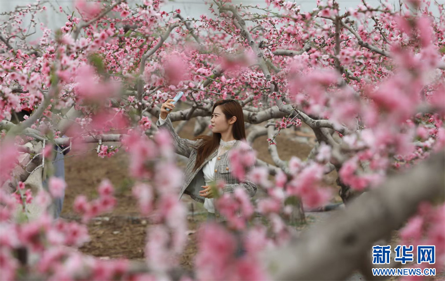 3月25日,游客在河南省济源市坡头镇清涧村百亩桃园打卡拍照。新华社发(段二平 摄)