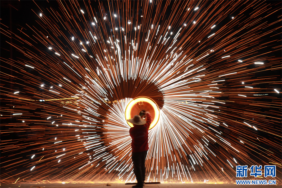 2月18日晚,在河南省安阳市内黄县文化体育中心,民间艺人表演打铁花。新华社发(刘肖坤 摄)